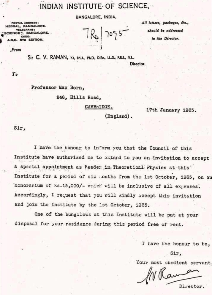అప్పటికే సీవీ రామన్ తన రామన్ ఎఫెక్ట్ కు గాను నోబెల్ బహుమతినందుకుని ప్రపంచవ్యాప్త చర్చగా మారిన రోజులు. అలా బోర్న్ ఉద్యోగం కోల్పోయిన వెంటనే సీవీ రామన్ నుంచి బోర్న్ కు ఓ లేఖ అందింది. ఆ లేఖ సారాంశమేంటంటే… ఎవరైనా ప్రతిభావంతులైన శాస్త్రవేత్తలను బెంగళూర్ ఐఐఎస్సీలో పనిచేయడానికి బోర్న్ ఏమైనా సిఫార్స్ చేస్తారా అని. అయితే, బెంగళూర్ ఐఐఎస్సీ గురించి పూర్తి వివరాలు తెలియకుండా.. తాను ఆ పని చేయలేనని బోర్న్ ఆ లేఖకు సమాధానమిచ్చారు.